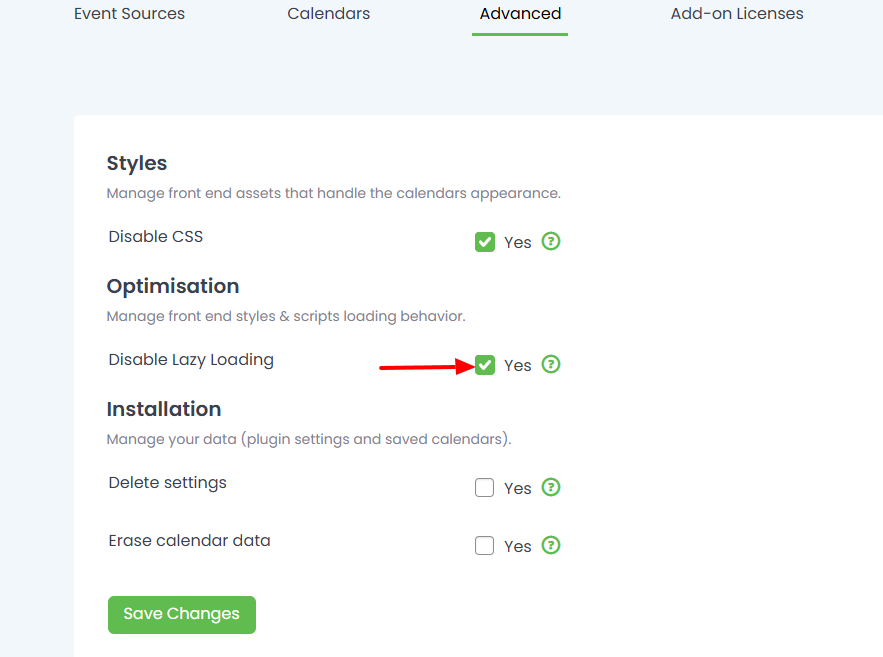 However, in some cases, this optimization may not work as expected with certain themes or page builders. If your calendar isn’t displaying properly, you may need to ensure the plugin’s scripts and styles load on all pages by disabling lazy loading.